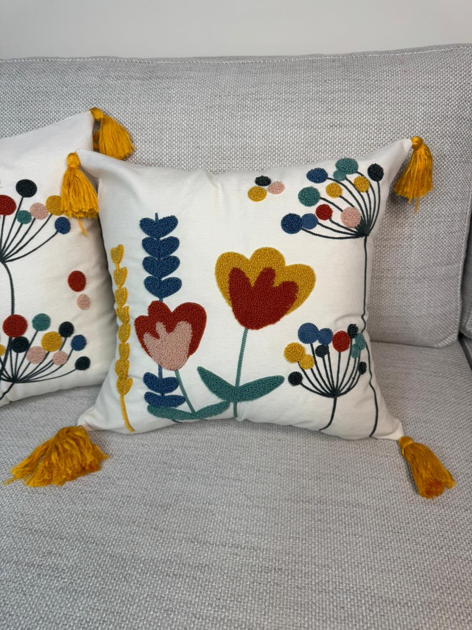 Brighten your home with the Vivid Bloom Collection – Tulip Meadow Cushion Cover. Designed in a 43x43 cm square shape, this cover showcases multi-color floral embroidery featuring tulip blossoms, playful meadow stems, and dotted floral bursts in warm shades of red, mustard, teal, blush, and green on a crisp white base. Finished with yellow tassels on each corner, it adds a modern yet artisanal touch to sofas, armchairs, and bedrooms.