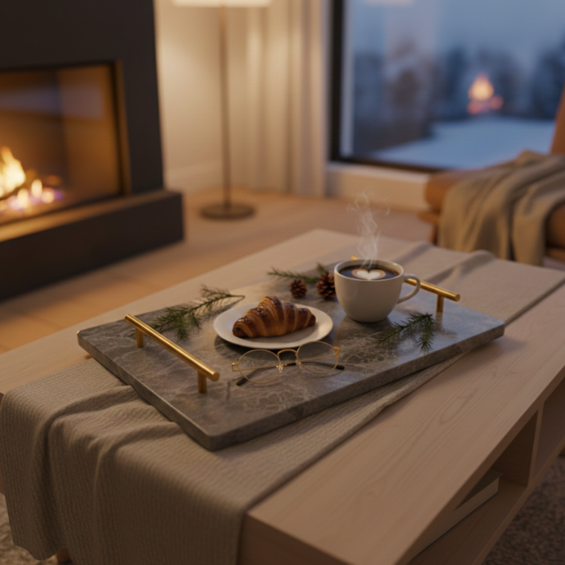 Each tray is hand-cut from natural stone, meaning no two pieces are alike. Its weight and texture give it a luxurious, grounded feel, while the metallic handles offer easy grip and a modern edge. The waterproof surface makes it ideal for both functional use and decorative display.
